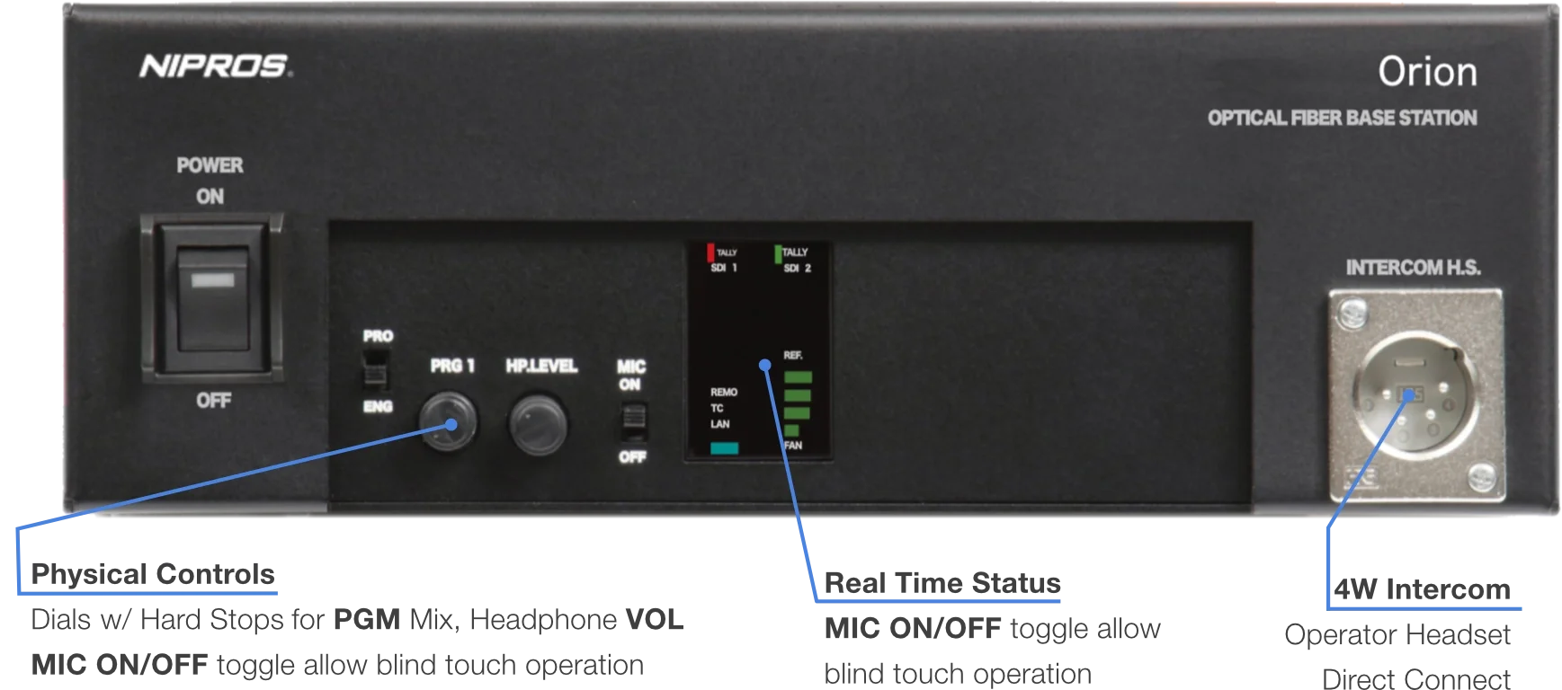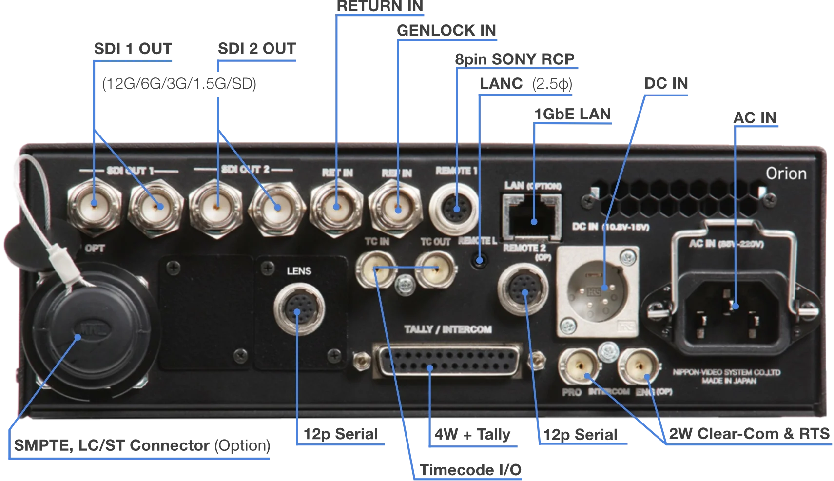 Orion's lightweight compact basestation equipped with every camera control interface for modern workflows, and all the connectors are dedicated native ports: 8p Sony RCP, 12p Serial with an additional dededicated 12P Iris channel, a LANC port and an independent 1GbE LAN port. 12G-SDI Return Channel, and Camera input channels 1&2 each have dual mirrored 12G-SDI outputs. The SDI outputs are re-clocked and provide a zero-latency output with a ideal waveform matching exactly the input. Timecode + loop-through, Reference input, and 2W Intercom inputs w/ Clear-Com / RTS support each have dedicated BNC Inputs, with a D-SUB 25pin connector for wet and dry Tally inputs and 4W Intercom. Despite the small form factor, the Orion Base Station includes dual power inputs, with an AC IEC connector input and a 4pin XLR DC input for varying workflows as well as redundant power.