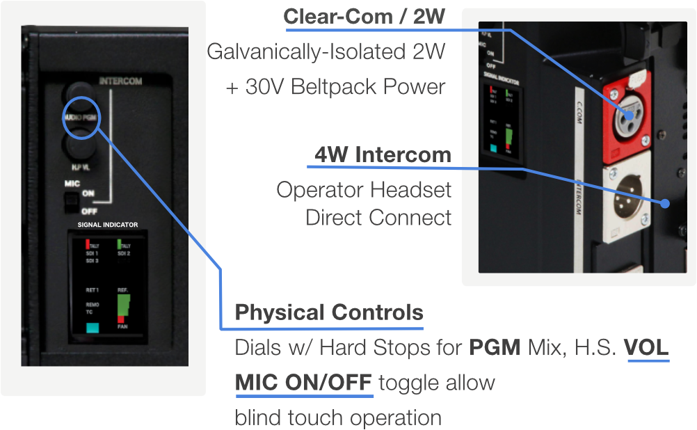 The front side of the station has quick-read status display, as well as physical intercom control dials which allow technicians to keep their eyes on the prize while using muscle memory to adjust their audio mix and levels. Finally, a full-size XLR-4Pin supports the connection of a headset using the native connector directly into the front of the station for easy comms to each camera channel.