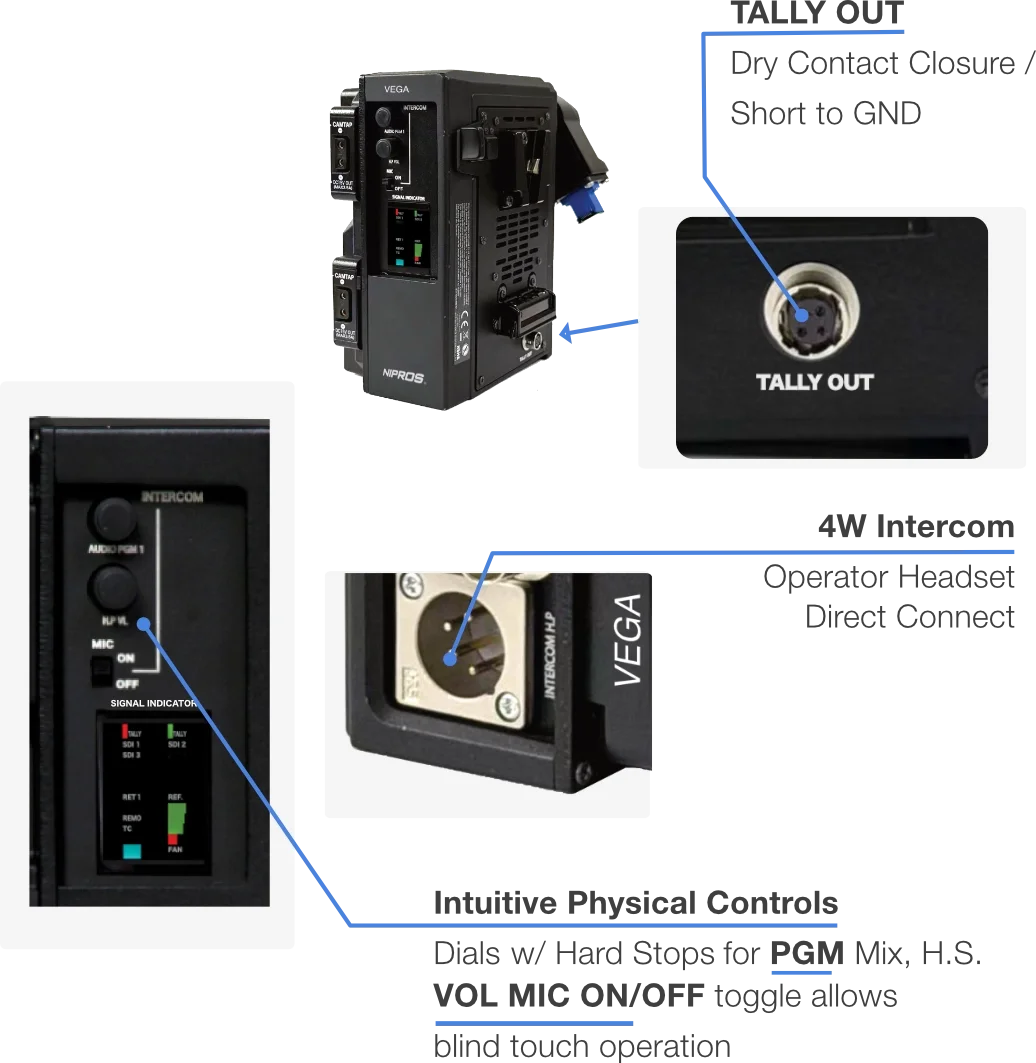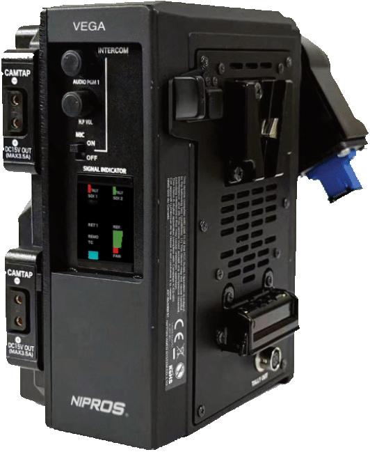 VEGA transforms lightweight gimbal cameras like the DJI Ronin 4D into compact remote broadcast camera channels. Vega system has a multi-format 12G-SDI input and a re-clocked 12G-Return Output. Connect different video signals on completely indepedent channels, and built-in 4W I.F. function without digital delay or complicated setup, plus Serial & LANC camera control ports, and wet and dry tally connections.
