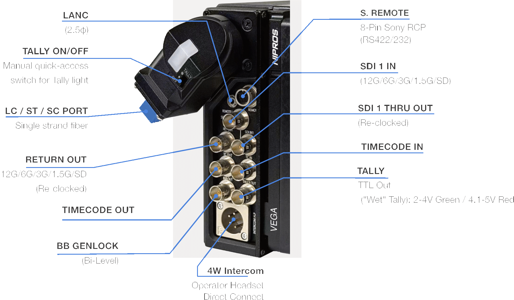 Vega's lightweight compact basestation equipped with every camera control interface for modern workflows, and all the connectors are dedicated native ports: 8p Sony RCP and a LANC port for camera control. Camera input channel has dual mirrored 12G-SDI outputs and 12G-SDI Return Channel has one output. The SDI outputs are re-clocked and provide a zero-latency output with a ideal waveform matching exactly the input. Timecode + loop-through, Reference input, and a D-SUB 25pin connector for wet and dry Tally inputs + 4W Intercom with Voltage-style intercom connection via BNC and Operator HS XLR4P connector and controls on the front of the Station. Despite the small form factor, the Orion Base Station includes dual power inputs, with an AC IEC connector input and a 4pin XLR DC input for varying workflows as well as optional secondary redundant AC power input.